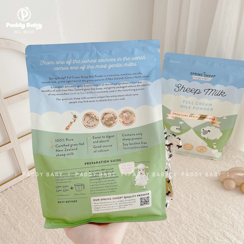 Spring Sheep sử dụng 100% sữa cừu nguyên chất từ New Zealand, quốc gia nổi tiếng với môi trường chăn nuôi trong lành và tiêu chuẩn kiểm soát chất lượng nghiêm ngặt. Cừu được nuôi thả tự nhiên, ăn cỏ, không sử dụng kháng sinh hay hormone tăng trưởng nhân tạo, đảm bảo nguồn sữa tinh khiết và an toàn cho trẻ nhỏ.