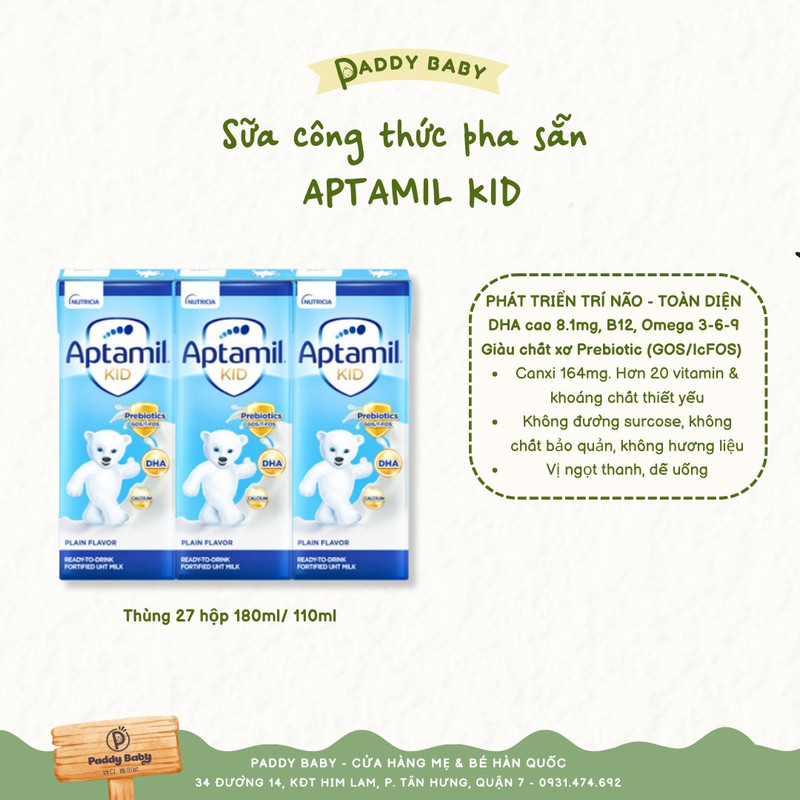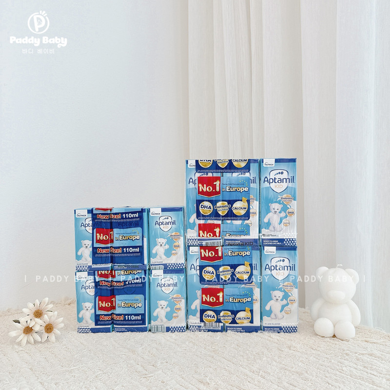 Aptamil Kid được đóng gói dạng hộp pha sẵn dung tích 180ml và 110ml, nhỏ gọn, dễ mang theo và sử dụng ngay mà không cần pha chế. Đây là lựa chọn tiện lợi giúp tiết kiệm thời gian nhưng vẫn đảm bảo bé nhận đủ dưỡng chất cần thiết mỗi ngày.